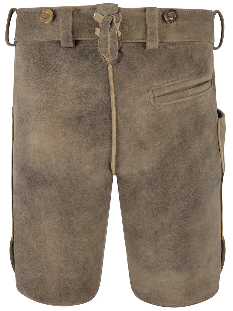 Mit ihrer zeitlosen Optik in Braungrau passt die kurze Lederhose zu jedem Anlass – ob Volksfest, Hochzeit oder traditionelle Feier. In Kombination mit Trachtenhemd und Haferlschuhen entsteht ein stilvoller Look, der Tradition und Moderne harmonisch vereint.